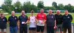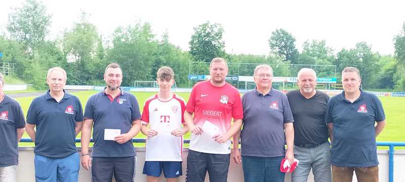 Glückwünsche an die Platzierten des Elfmeterschießens (von links): Stefan Posset (Organisator), Johannes Aigner (FW Weiherhammer), Timo Kraus (FC Haudanehm), Michael Stregl (Bayernfanclub Pirk), Hans Heibl (Vorsitzender Bayernfanclub Weiherhammer), Bürgermeister Ludwig Biller und Stefan Schwarzmeier (Organisator).